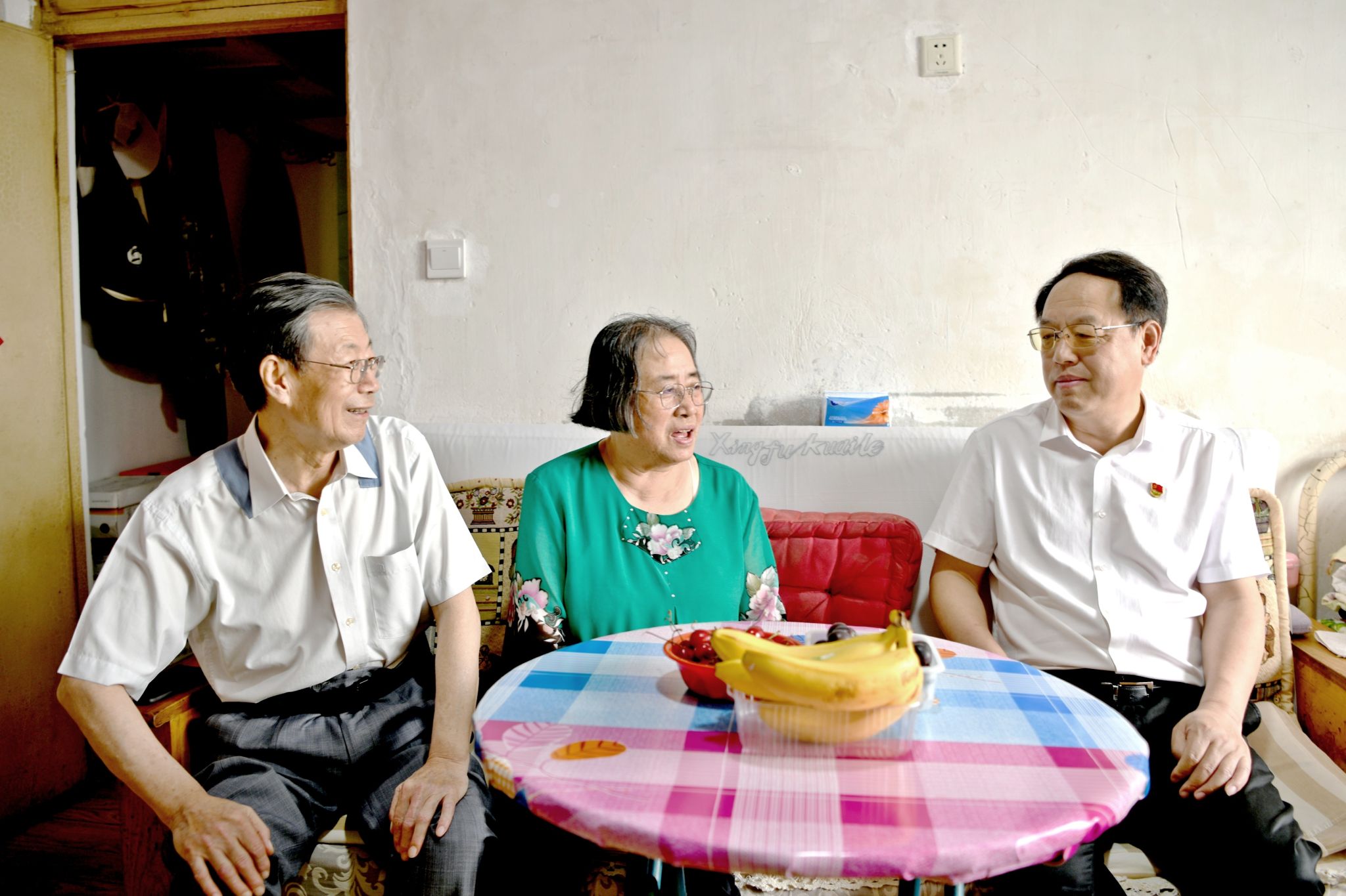 在“光荣在党50年”老党员郑占响老师家中,贾玉明与郑占响老师和杨敢老师聊起了退休后的生活,询问是否有需要学校帮助解决的实际困难,并为郑老师颁发了“光荣在党50年”纪念章,向她长期以来恪尽职守,兢兢业业为党工作、为学校事业发展所做的贡献致以崇高的敬意。他表示,郑老师和杨老师退休不退岗,在团结凝聚老同志、传递组织关怀等方面持续发光发热,这份坚毅执着和奉献精神让人钦佩。希望两位老同志能够继续关注和支持学校发展,同时叮嘱相关职能部门要认真听取老党员对学校工作的意见建议,以敬重之心、关爱之情、务实之举做好服务保障工作。